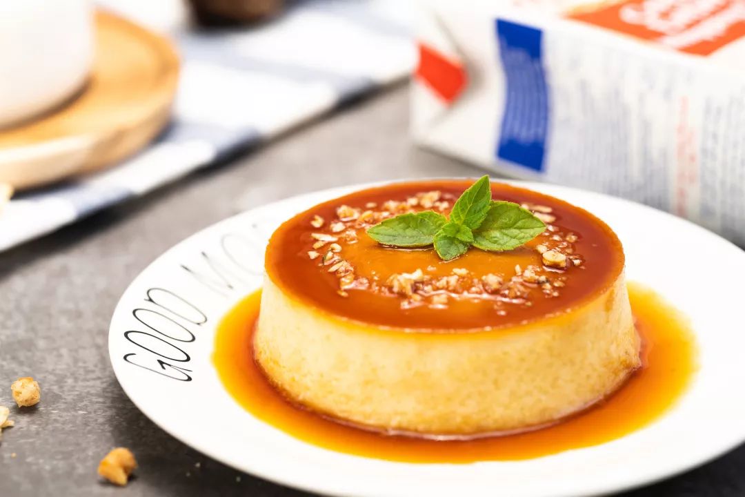 ③模具中倒入一层焦糖酱,稍微晃动模具,使其均匀铺满底部,备用。