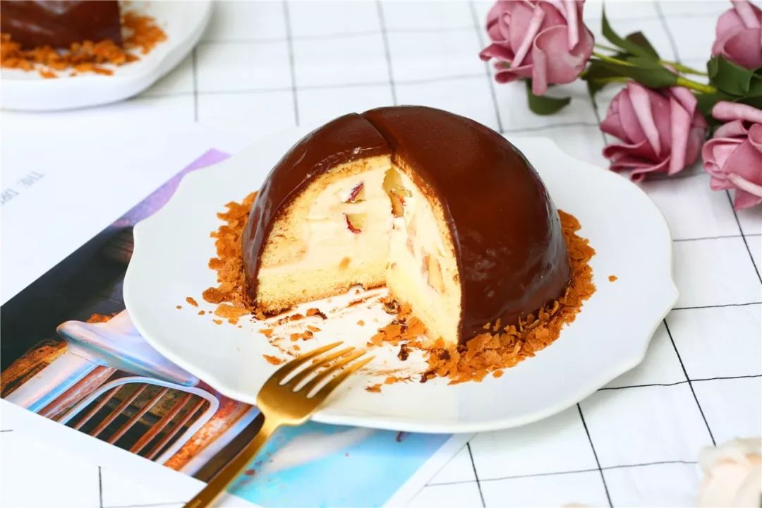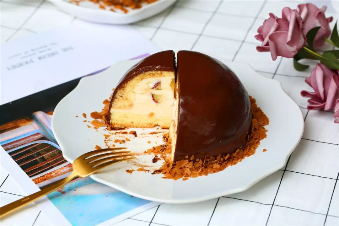 现在正好是吃桃子的季节就直接拿来做夹心了如果还是想用草莓的话那就是一颗巧克力草莓炸弹啦半球形蛋糕还挺萌的用碗做造型也很方便!如果用的碗深那做出来的半球就瘦高反之碗浅的话就是矮胖款啦