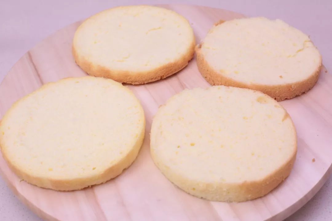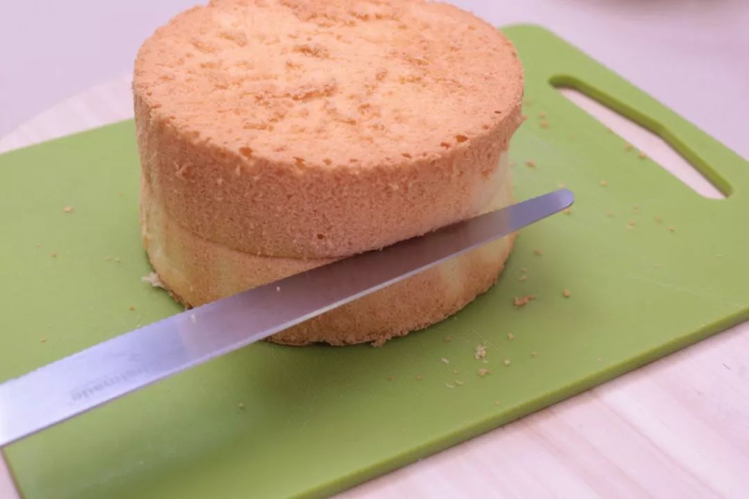 组装:①将戚风蛋糕脱模,大致平均分成四片。