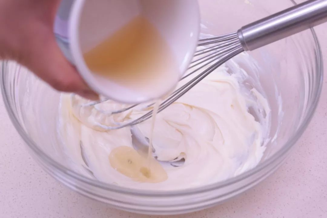 ③淡奶油加细砂糖一起打发至六分发有纹路微微流动的状态,加入到奶酪糊中拌匀。