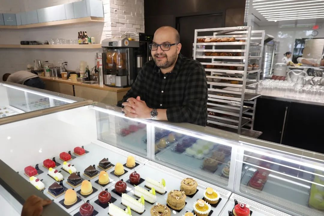 今天又是勤劳的光头强大B哥Antonio Bachour(下图),最新的创作“EXOTIC FRUIT PAVLOVA”,柔和细腻的乳白色点缀着几点黄、几点绿,非常可爱的小清新,配方依旧是亲民的简单路线——空壳帕夫洛娃+热带果酱+热带水果奶油,挤椰子甘纳许,点缀百香果库哩~每个组成的小配方都不难,脑补一下摆满柜台内的状态