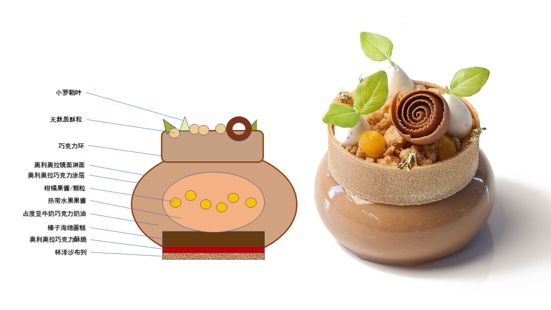 提示:↑点击上方"世界烘焙配方"快速关注cription-url="https://mmbiz.qpic.cn/mmbiz_jpg/PR7JPt3C5zawKVqAvnVjgkJkKicO3wLSfvxkngAAoDWUqJLBBmuPX3tz9EErvItMfV2IGR6HnCYhZnibRA6KM6Ww/0?wx_fmt.jpeg" data-cropselx1="0" data-cropselx2="578" data-cropsely1="0" data-cropsely2="255" data-ratio="1.4992503748125936" data-s="300,640" src="http://www.yinpinjie.com/file/upload/202302/24/154350471.jpeg" data-type="jpeg" data-w="667" />今天周末,轻轻松松的学学Chef Gregory Doyen(上图)的这个萌萌哒小可爱ORYOLA吧!说在前边:配方看上去会感觉很长很长很长...只是写的比较细致,新手看了都能按步骤做出来的那种详细,实际上它是个标准的法式甜点:夹心、奶油/慕斯、淋面,所以别被长度劝退,好东西还是要用心学学滴~95qq☜今日配方下载提取码每天20:30更新,每篇文末左下角“阅读原文”点击进入均可下载当日配方、视频或图片文件,省去大家自己复制黏贴的麻烦,配方文件无任何水印设置;“提取码”因近日度娘抽风搞怪,暂不提供无码下载服务,只能按她的规矩来,所以下载之前先把这个“提取码”复制一下~另外,部分地区可能因为某些不可抗原因导致无法直接点击阅读原文,可以在文末的【置顶留言】中找到链接和提取码。奥 利 奥 拉ORYOLABy Gregory Doyen配方量:12个榛子海绵蛋糕【653克】190 克……全蛋110 克……细砂糖#1130 克……榛子粉 40 克……低筋面粉 2 克……玉米淀粉110 克……蛋白 45 克……细砂糖#2 1 克……盐 25 克……黄油制作:1、将全蛋和细砂糖#1打发。2、期间将榛子粉、低筋面粉和玉米淀粉混合过筛。3、将蛋白和细砂糖#2打发为蛋白霜。4、将融化的黄油加入到“步骤1”的蛋糊中拌匀,然后将蛋白霜加入轻轻拌匀,最后将混合过筛的干粉加入拌匀。5、倒入硅胶烤盘内抹平(型号:Tapis roulade 03,规格:32.5x32.5 cm)。6、入烤箱以165℃烘烤约12分钟。无麸质酥粒 【367.5克】180 克……黄油165 克……杏仁粉 85 克……米粉 45 克……玉米澱粉1.5 克……海盐(盐之花)制作:1、全部材料混合搅拌至柔软松散砂砾状态,冷冻20分钟。2、倒在烤盘上以165℃烘烤25分钟(每10分钟时适当搅动以获得均匀的着色)。3、出炉冷却,密封储存待用待用。4、注:作为每一个酥脆片都要用到的基础材料,可以提前制作并室温储存。奥利奥拉巧克力酥脆【265.5克】 35 克……30%白巧克力(Weiss Oryola white chocolate 30%) 75 克……35%榛味牛奶巧克力(Weiss milk gianduja 35%)110 克……无麸质酥粒(配方↑) 25 克……薄脆片 20 克……烤熟的榛子粉0.5 克……盐之花(海盐:fleur de sel)制作:1、将两种巧克力融化至35℃,将其他材料加入轻轻拌匀。2、放在两张烘焙油纸之间擀压至2.5毫米。3、放入冰箱内几分钟凝结稳定后裁切为直径5厘米的圆形待用。※30%白巧克力:Weiss Oryola white chocolate 30%:此巧克力为意大利榛子味道的白巧克力,如果没有,可以用牛奶巧克力+榛子帕林内替代。※35%榛味牛奶巧克力:Weiss milk gianduja 35%。橙橘果酱(用于“热带水果果酱”)【810克】250 克……橙子(切小块)250 克……柑橘(切小块)200 克……水(用于煮糖浆) 2 克……盐 10 克……葡萄糖浆100 克……细砂糖制作:1、将切成小块的橙子和柑橘放入水中(此为配方之外的水),加入一点盐,小火煮开10分钟,然后再冰水上快速降温。2、将水和葡萄糖浆、砂糖煮成糖浆,加入降温过滤出来的橙子和柑橘,一直煮至糖浆完全蒸掉,然后倒入料理机中搅拌均匀。热带水果果酱【290克】100 克……100%柑橘果茸(宝茸Boiron) 40 克……芒果果茸(宝茸Boiron) 40 克……鲜百香果 40 克……柑橘果酱(配方↑) 25 克……转化糖浆 20 克……细砂糖 5 克……慢凝果胶粉 20 克……吉利丁冻(1:6.5)制作:1、将果茸、鲜百香果和柑橘果酱混合拌匀,与转化糖浆一起加热至40℃。2、将细砂糖与慢凝果胶粉混合拌匀后加入并煮沸。3、再将吉利丁冻加入拌融。4、离火降温待用。占度亚牛奶巧克力奶油【380克】 75 克……35%淡奶油 75 克……牛奶 35 克……蛋黄180 克……35%榛子牛奶巧克力(Weiss milk gianduja 35%) 15 克……吉利丁冻(1:6.5)制作:1、将液态淡奶油与牛奶混合加热至40℃。2、加入蛋黄拌匀后中小火加热并搅拌至83℃,并持续20秒。3、倒在巧克力上充分搅拌乳化至顺滑,再将吉利丁加入拌匀。4、充分搅拌乳化后降温待用。奥利奥拉巧克力涂层【430克】300 克……30%白巧克力(Weiss Oryola white chocolate 30%)100 克……可可脂 30 克……葡萄籽油制作:1、将巧克力与可可脂融化,加入葡萄籽油拌匀。2、最佳使用温度为35℃。奥利奥拉镜面淋面【577克】 55 克……水110 克……细砂糖110 克……葡萄糖浆 35 克……无糖炼乳 35 克……甜炼乳115 克……30%白巧克力(Weiss Oryola white chocolate 30%) 60 克……吉利丁冻(1:6.5) 55 克……镜面果胶 2 克……金色闪粉制作:1、将水、砂糖和葡萄糖浆混合煮沸。2、加入无糖炼乳和甜炼乳拌匀并再次煮沸。3、倒在巧克力、吉利丁、镜面果胶和金粉上,用手持均质机充分搅拌乳化至光亮顺滑。4、离火降温冷藏(4℃),使用时回温至27℃。林泽沙布列【385克】125 克……低筋面粉 75 克……糖粉 50 克……榛子粉 5 克……香草粉(天然)100 克……黄油 30 克……蛋黄制作:1、全部干粉类材料过筛后放入装有扁桨的搅拌缸内,与冷藏切丁的黄油混合搅打至形成松散均匀的砂粒状态。2、将蛋黄加入,中低速搅拌成面团状。3、冷藏2小时。4、在两张烘焙油纸或塑料薄片之间擀压至3毫米厚度。5、冷