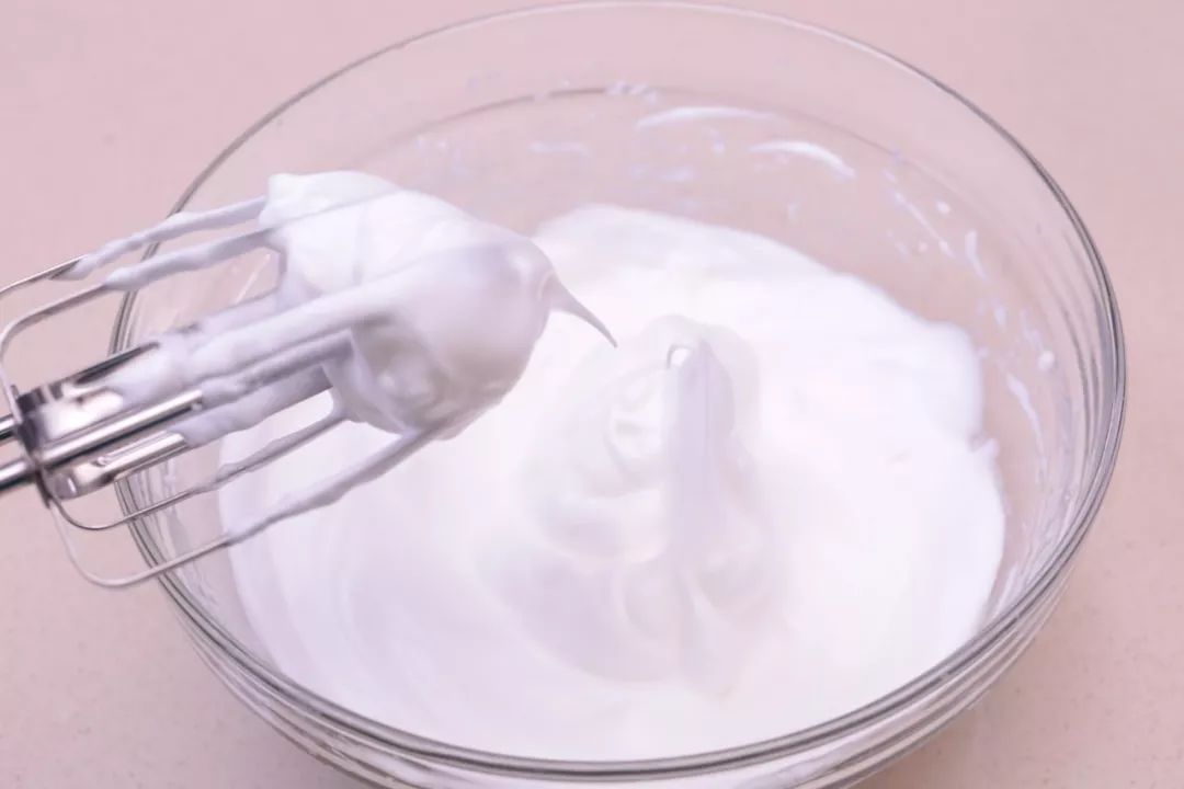 ③从冰箱取出蛋白,加少许柠檬汁,分三次加入细砂糖,最终打发至小弯钩状即可。