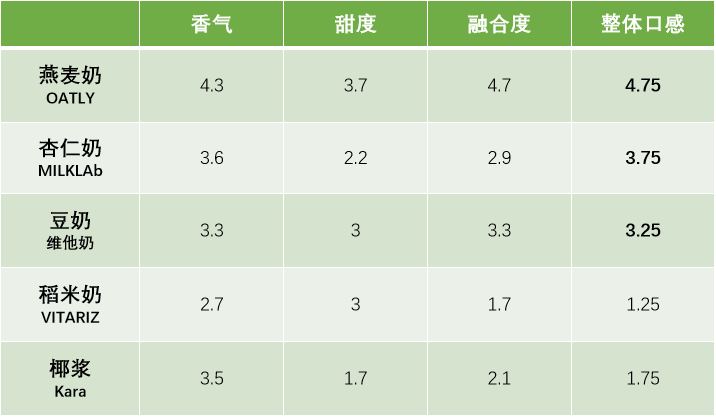 Jimmy咖啡师整体测评后,燕麦奶与咖啡的融合度最好,豆奶拿铁也不错,杏仁奶拿铁的冰饮比热饮更好喝。以上三款,咖啡馆可以直接根据自家豆子的烘焙程度来选择种类和品牌。稻米奶完全不适合,椰浆可以用来调配创意咖啡。
