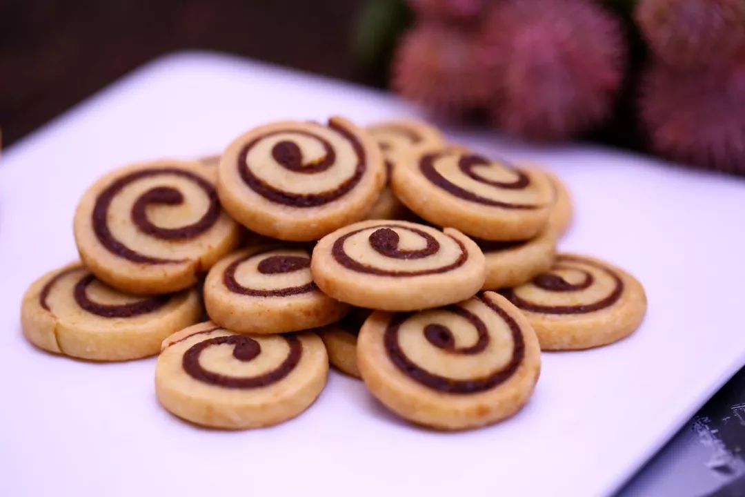 整形与烤制:将冷藏好的派皮取出,切掉边缘,均匀地抹上咖啡馅或抹茶馅,然后将其卷起来,放入冰箱冷藏20分钟,取出切成0.5CM的厚度,放入烤箱,170度,中上层20分钟。温馨提示:卷的稍微紧一些,烤出来的纹路没有空隙会更好看哦。