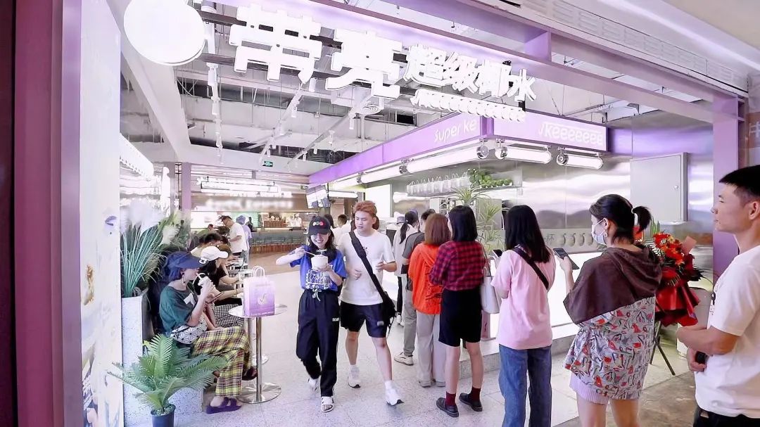 总之,独特的包装设计+网红商圈的选址,让不少前来游玩的游客都拿着这款产品与长沙地标建筑拍照,社交媒体上打卡不断。据了解,这是长沙品牌带壳,今年5月在长沙五一广场开出首家门店,产品只做椰子的延伸,客单价在15~25元之间,月营业额做到了近30万。6月份,带壳在长沙10店齐开(另有10家门店正在筹备中),在当地获得了一定的关注度。这个月,带壳旗舰店正式开业,门店VI设计及产品线迎来了一波整体升级。- 选择紫色作为品牌主题色,更具有夏日清凉感,门头、员工帽子工装统一使用主题色,增添视觉冲击力;产品线也大变样,除了真空包装的椰子水,还有700ml“冰上加冰”系列、椰子冻系列等等。