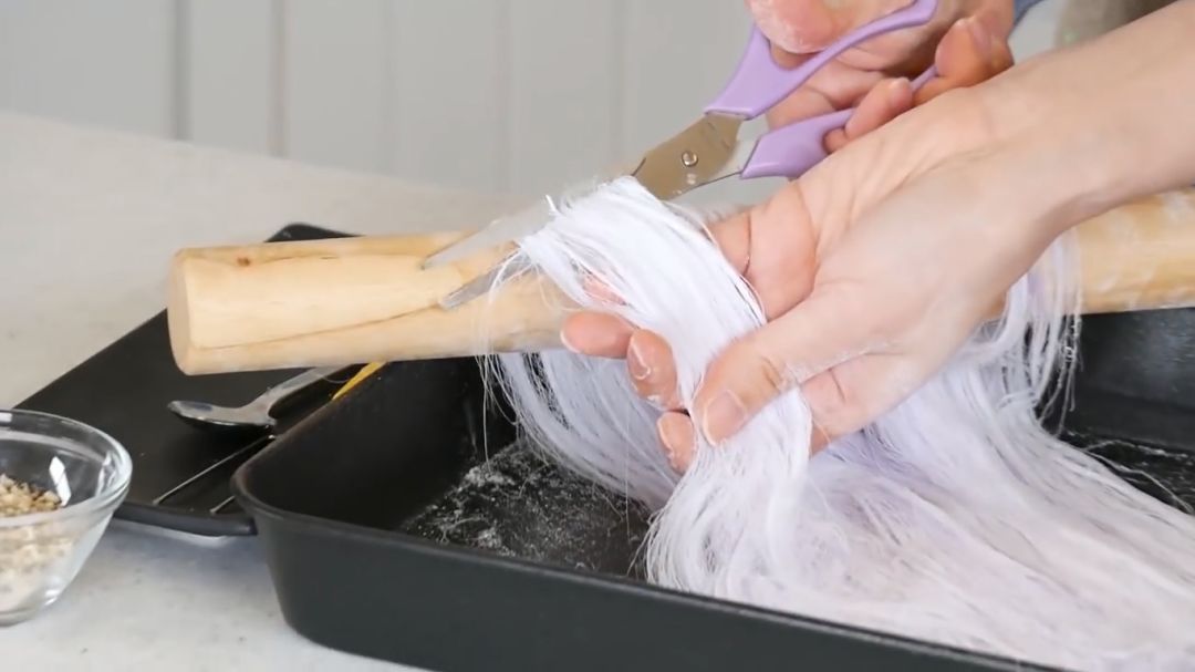 ⑥做好的糖丝可以挂在擀面杖上先欣赏一会儿,然后再用剪子剪成合适的长短来包馅。