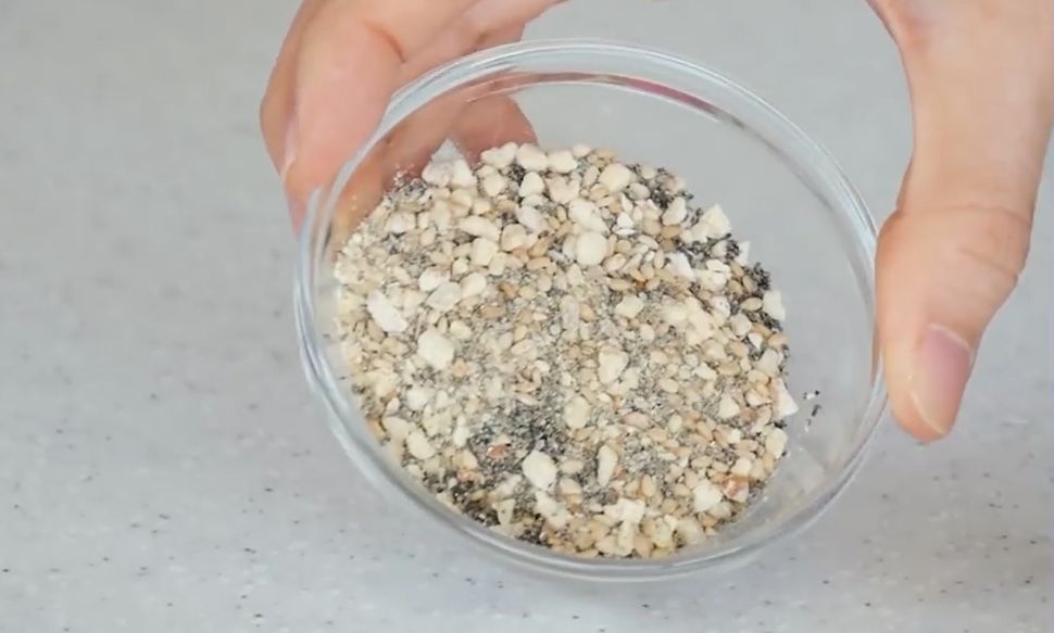 ⑦把提前备好的坚果碎放在糖丝中间的位置,用小工具卷起来,卷四下左右。