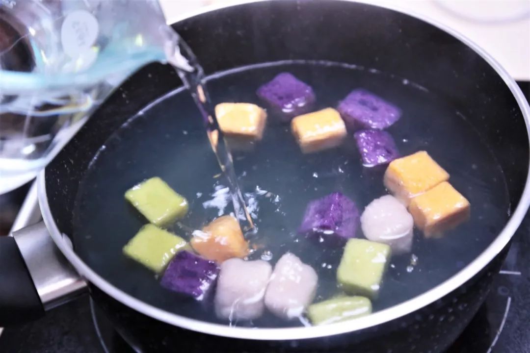 ⑥将水烧开,放入适量芋圆、地瓜圆、紫薯圆、抹茶圆,煮至再次沸腾。