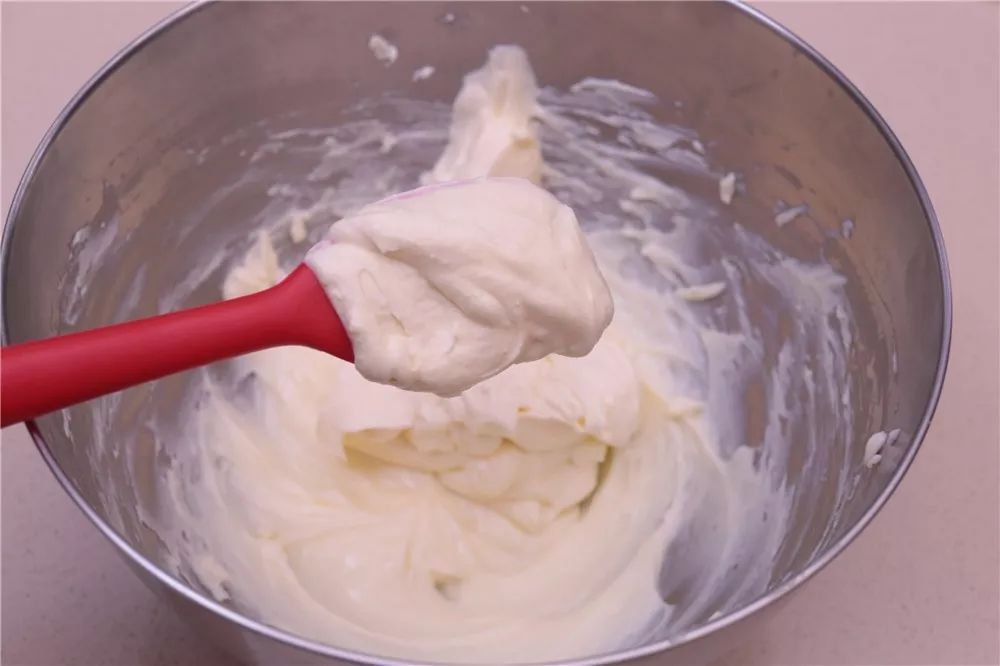 ②再依次加入酸奶油、鸡蛋液、香草精、柠檬汁,每次加完一种材料都搅拌均匀后再加下一种,以防结块。