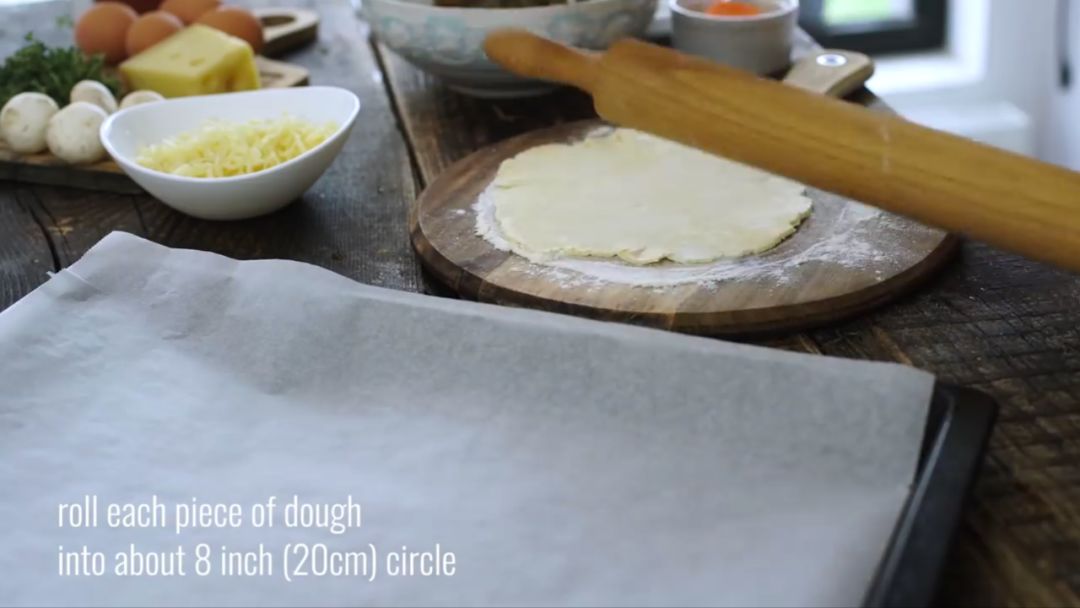 ⑧将每张派皮放在衬有烤纸的烤盘上;将奶酪撒在每张派皮上,派皮边缘预留2厘米;将蘑菇馅料撒在奶酪上。