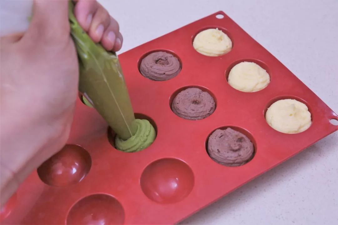⑤将不同颜色饼干面糊挤入硅胶模具八分满,上端有不平整的部分,可用手指沾水后抹平。