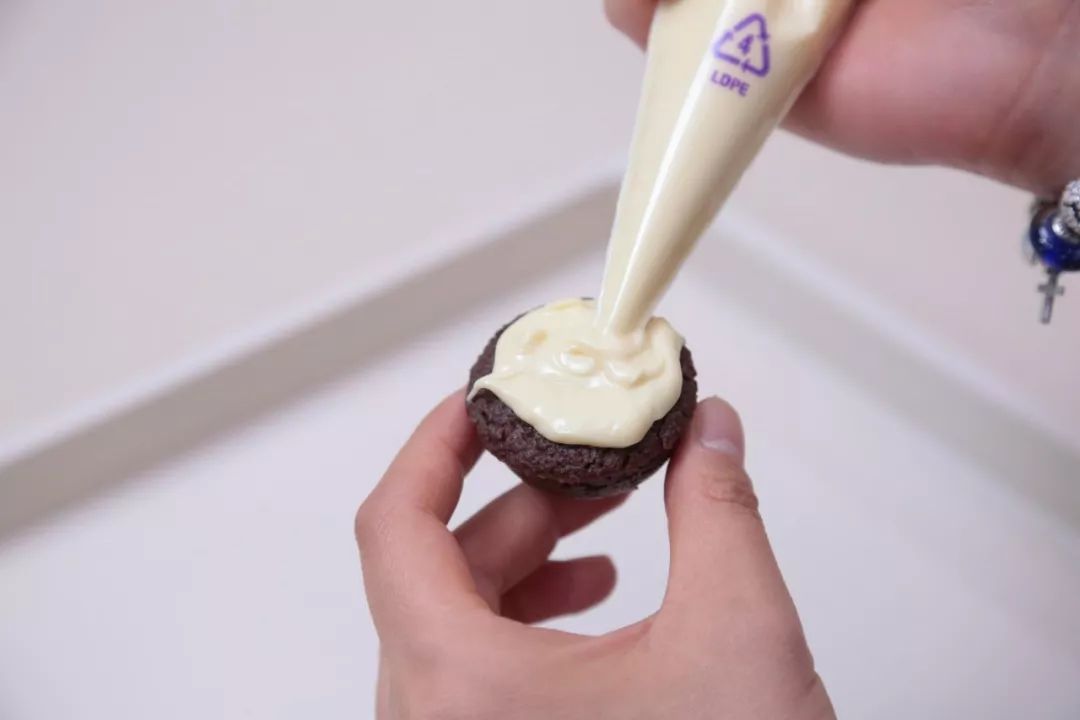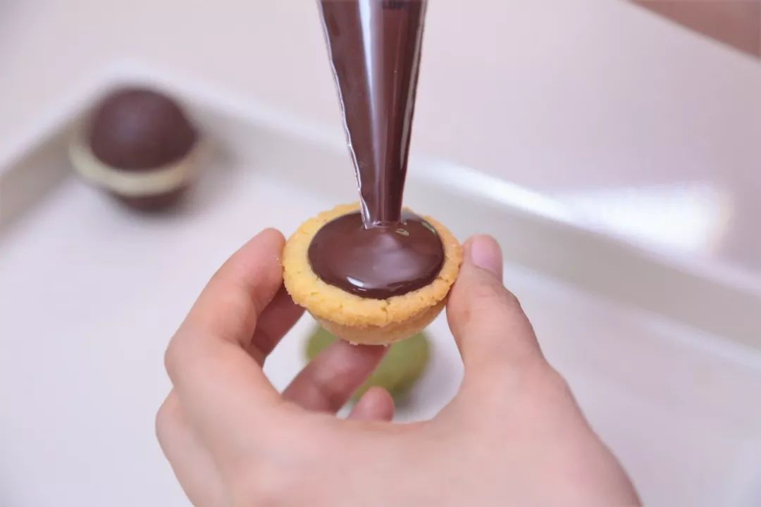 ⑦将巧克力隔水融化,装进裱花袋,静置约10-15分钟使巧克力降温至质地变浓稠、流动性降低。