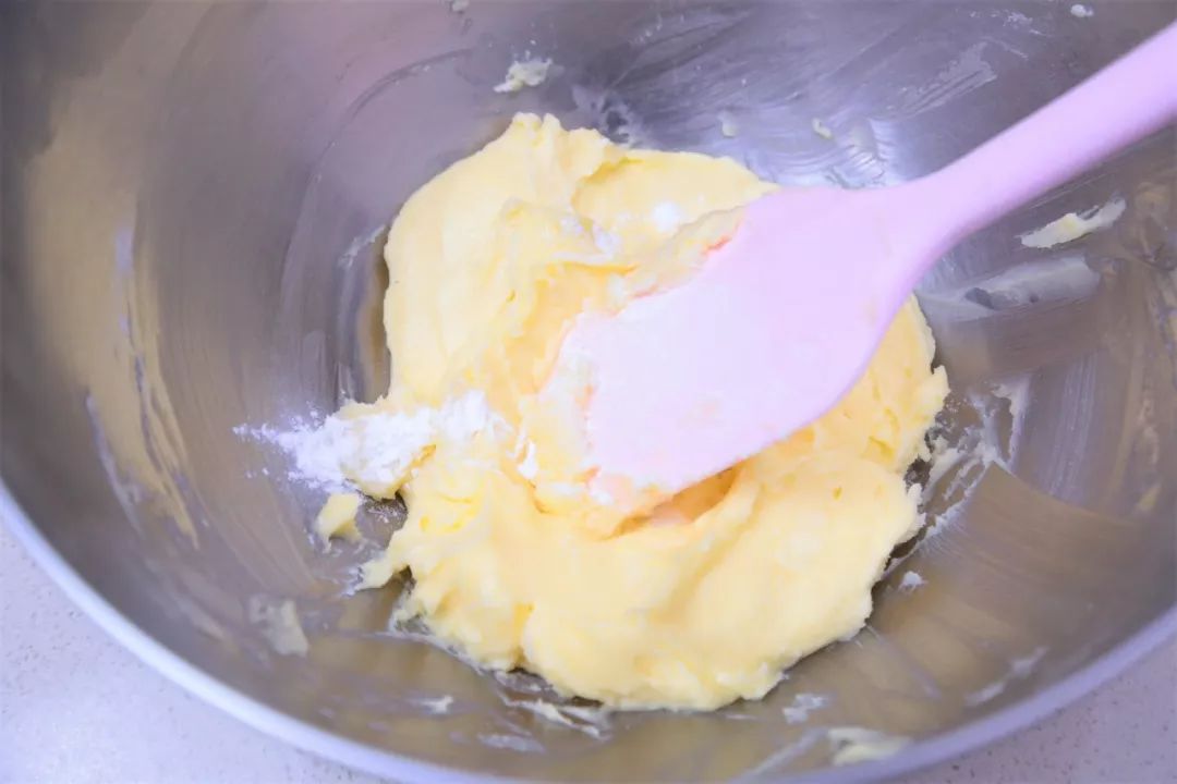 ③将混合物均分成3份,分别过筛加入各自对应的低筋面粉和可可、抹茶粉,用刮刀搅拌均匀。