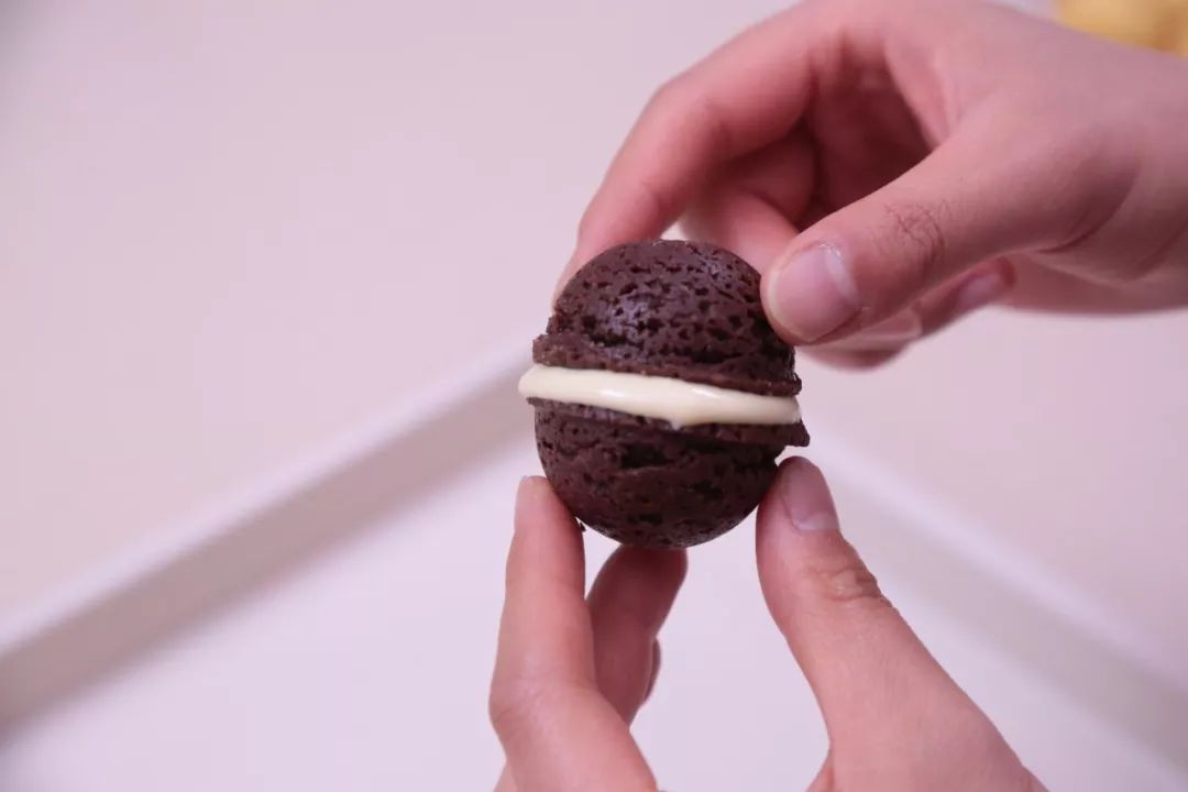 ⑧在饼干较平的一面挤上巧克力(若接触面不平可用小刀修整下),将两片饼干粘合起来,室温静置或冷藏至巧克力凝固即可。