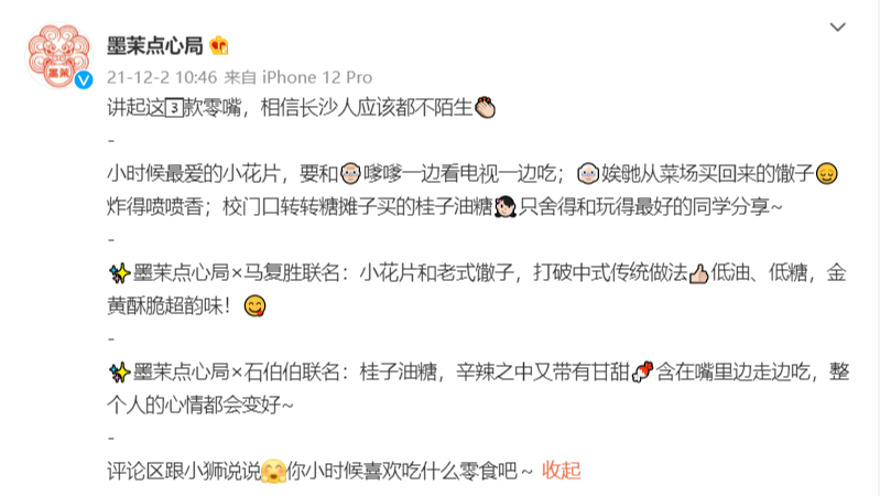 虎头局渣打饼行微博推文图片来源:微博@虎头局渣打饼行墨茉点心局则把握年轻人对于本土文化的认同感,在新店开业的过程中,适时推出线下活动、限定跨界产品,抱着和年轻人做朋友的心态,积极地和消费者玩在一起。“一米长麻薯”挑战邀请消费者带着近一米长的麻薯包装盒拍照打卡,上传网络,用“二次创作”的方式促进消费者和品牌的互动,并直接提升了新品的购买率。