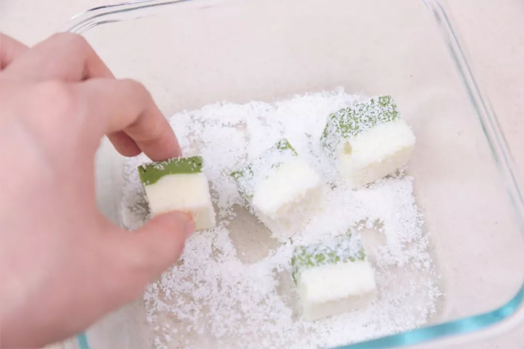 ⑦将凉糕连着保鲜膜一起从盒中取出,修边后切块,滚上椰蓉即可。