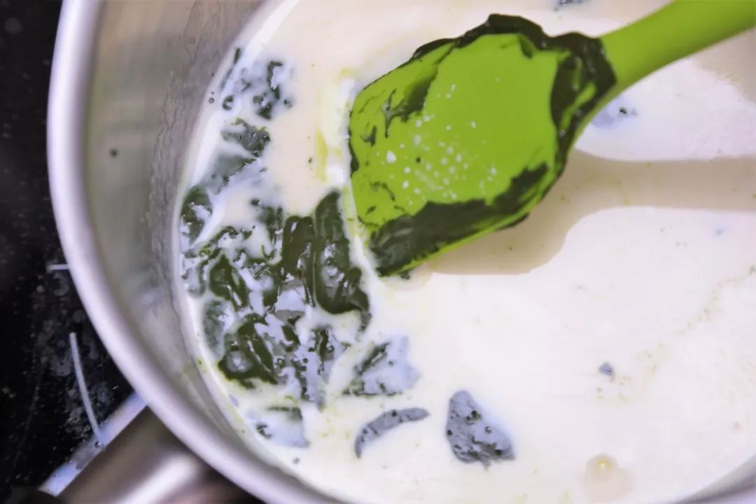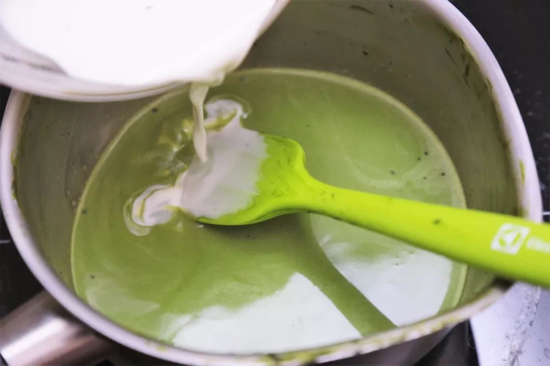 ②剩余的牛奶倒入锅中煮热,倒出20g与抹茶粉用茶筅搅匀。
