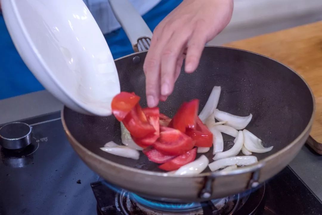 【4】煸炒在炒锅中加入适量色拉油,将洋葱丝和番茄片放入锅中煸炒。