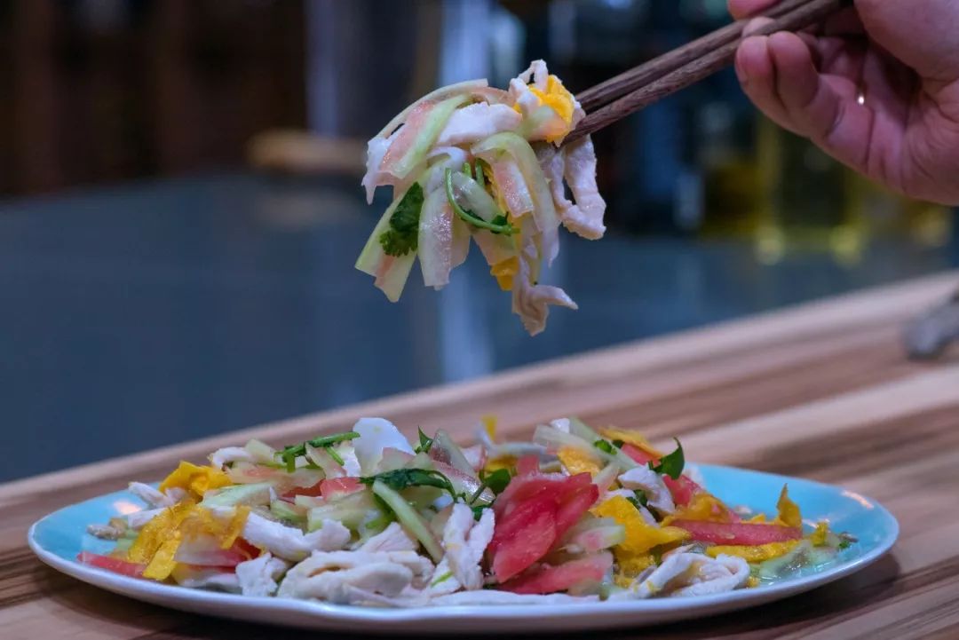 【11】冷却鸡丝将汆烫好的鸡丝放入凉水中浸泡冷却备用。