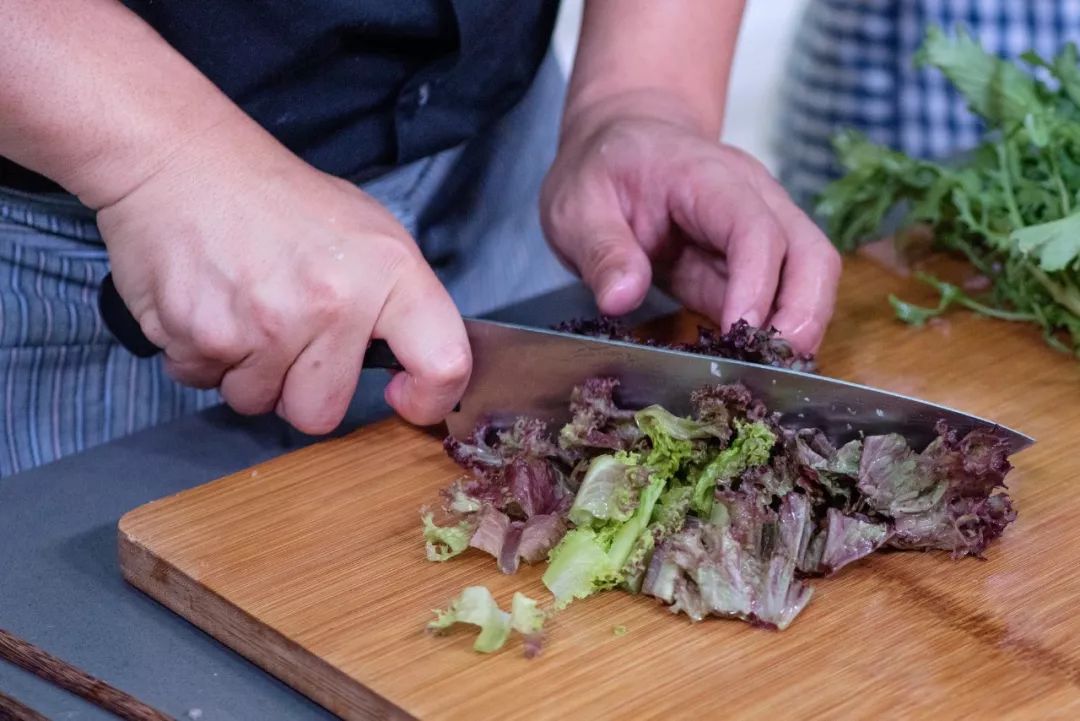 【8】切生菜将综合生菜切段后放入碗中备用。
