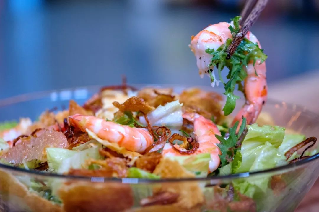 【12】组装将处理好的虾仁放入生菜碗中,淋上酱汁,再放入葡萄柚果肉,最后将碗中的食材拌匀。