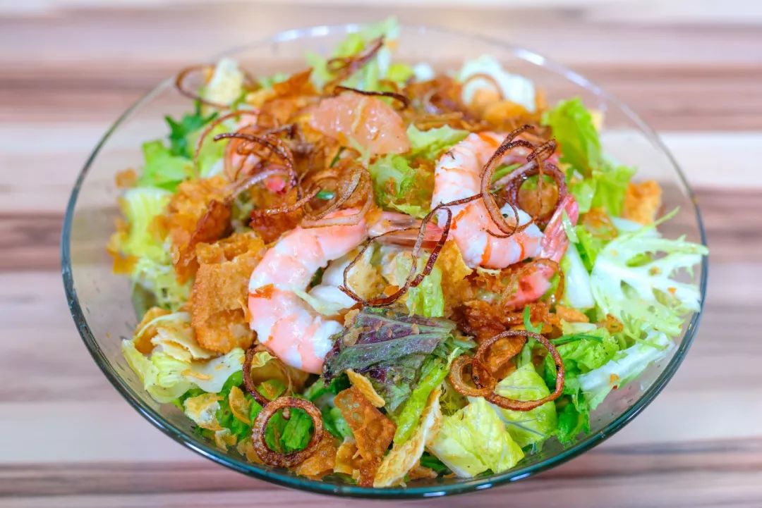 【13】盛盘将拌匀的沙拉放入成品碗中,再撒上炸得酥脆的红葱头圈和馄饨皮即可。