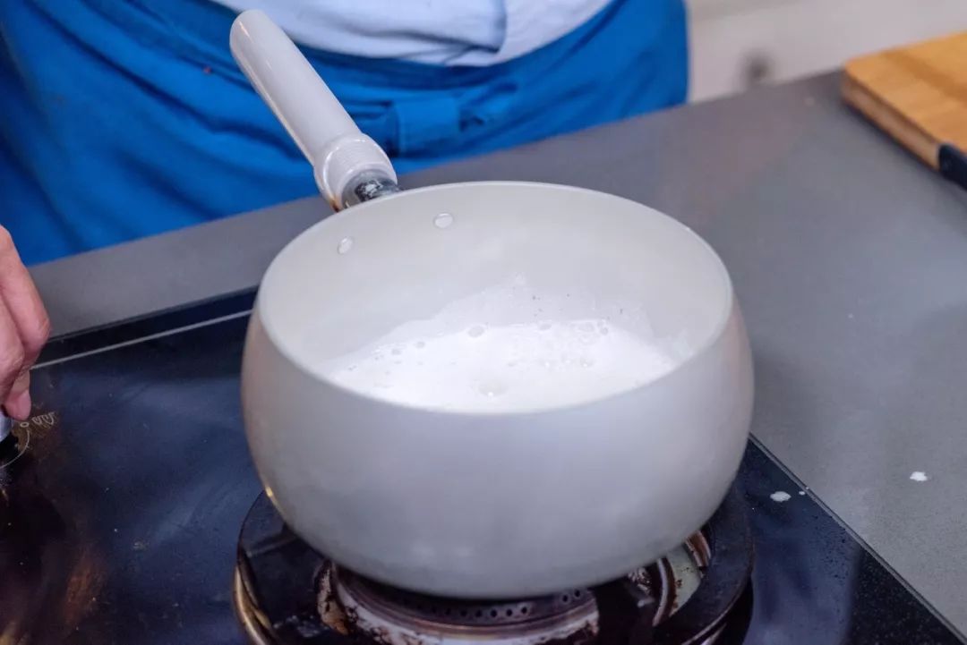 【6】煮坚果饮将打好的煎果饮倒入锅中,再加入适量白糖和豆浆搅拌均匀后煮至沸腾。Tips▼