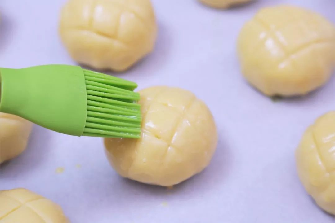 做好的蛋黄酥远看上去跟真的菠萝包简直一毛一样在原版基础上为菠萝外皮压上纹路可爱值增加了一万点看一眼就萌得人心化~