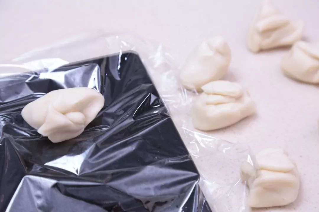 ⑦包入馅料,照着包油酥的方式,从两旁推挤收口,放入保鲜膜中。