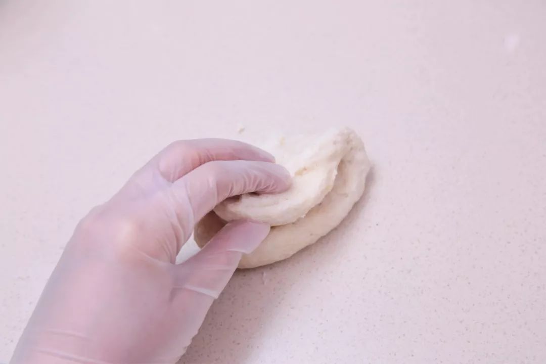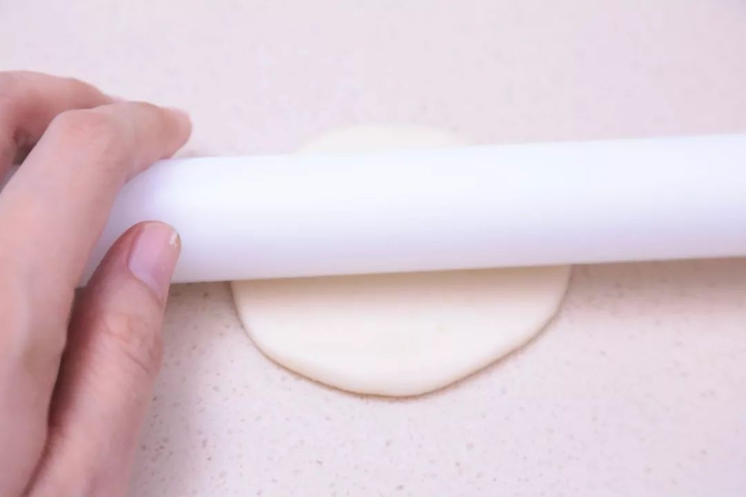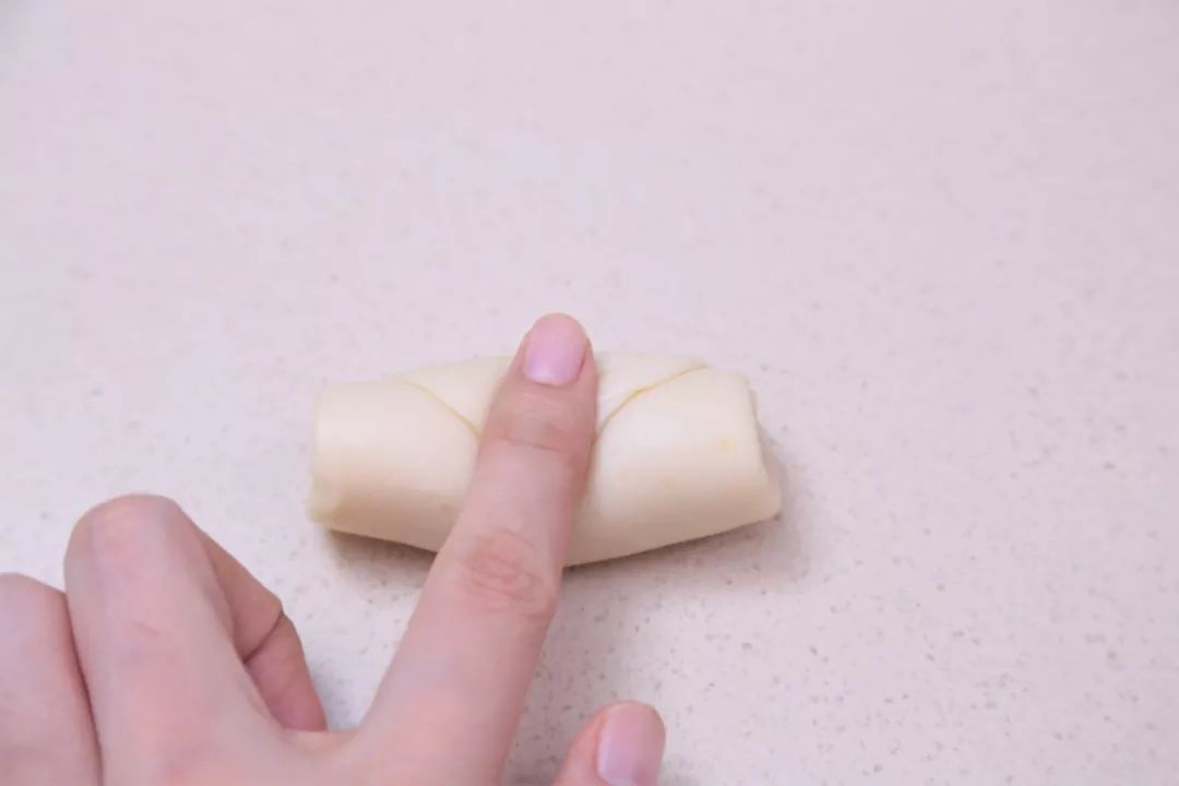 ⑥取一个油皮,收口处朝上,手指从中央按压一下,将两头并拢,压下擀成圆片。