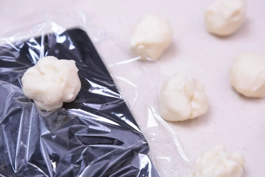 ④从一端开始紧密卷起面团,放入保鲜膜中保湿。