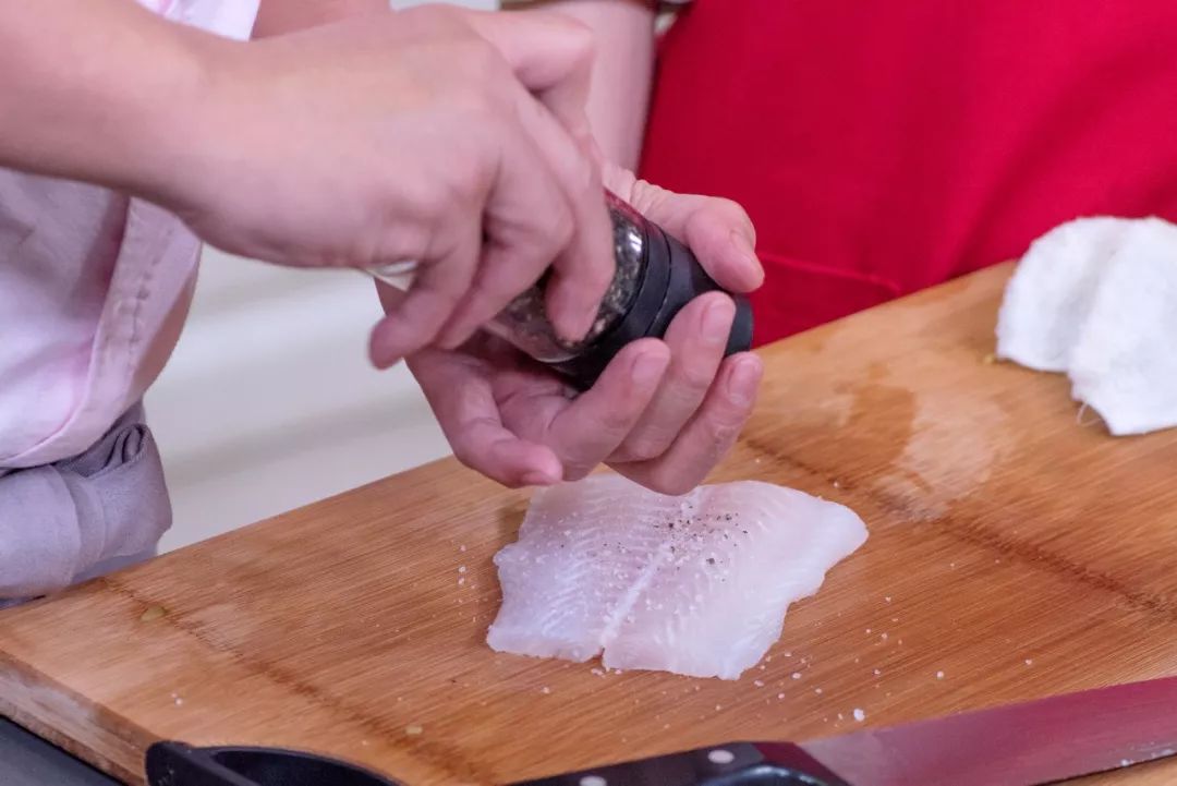 【5】 腌鱼排放入适量盐和黑胡椒。