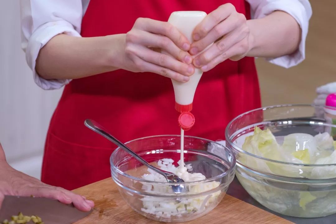 【2】调制塔塔酱放入切好的酸黄瓜和适量美乃滋,将其搅拌均匀。
