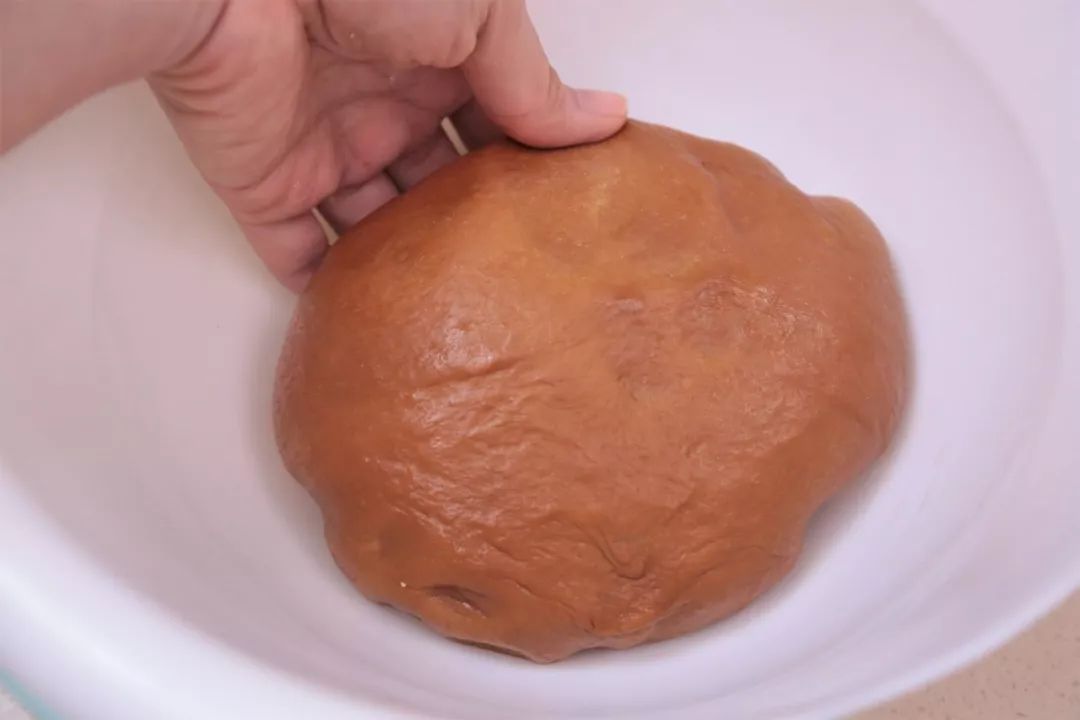 ④放入干净的搅拌盆或锅中,盖上保鲜膜或锅盖,放在温暖处发酵约1小时,至原体积的2倍大,手指戳入面团后,洞口不回缩、不凹陷就可以了。
