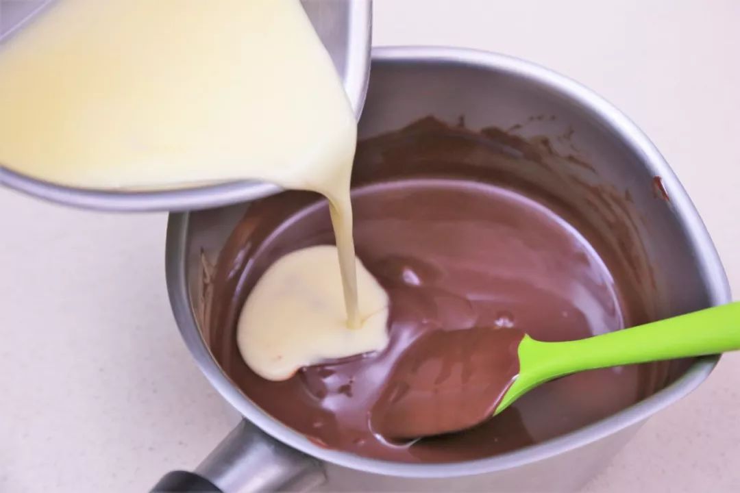 ③将淡奶油液分数次倒入巧克力中,用刮刀缓慢搅拌均匀,尽量不要让液体产生气泡。