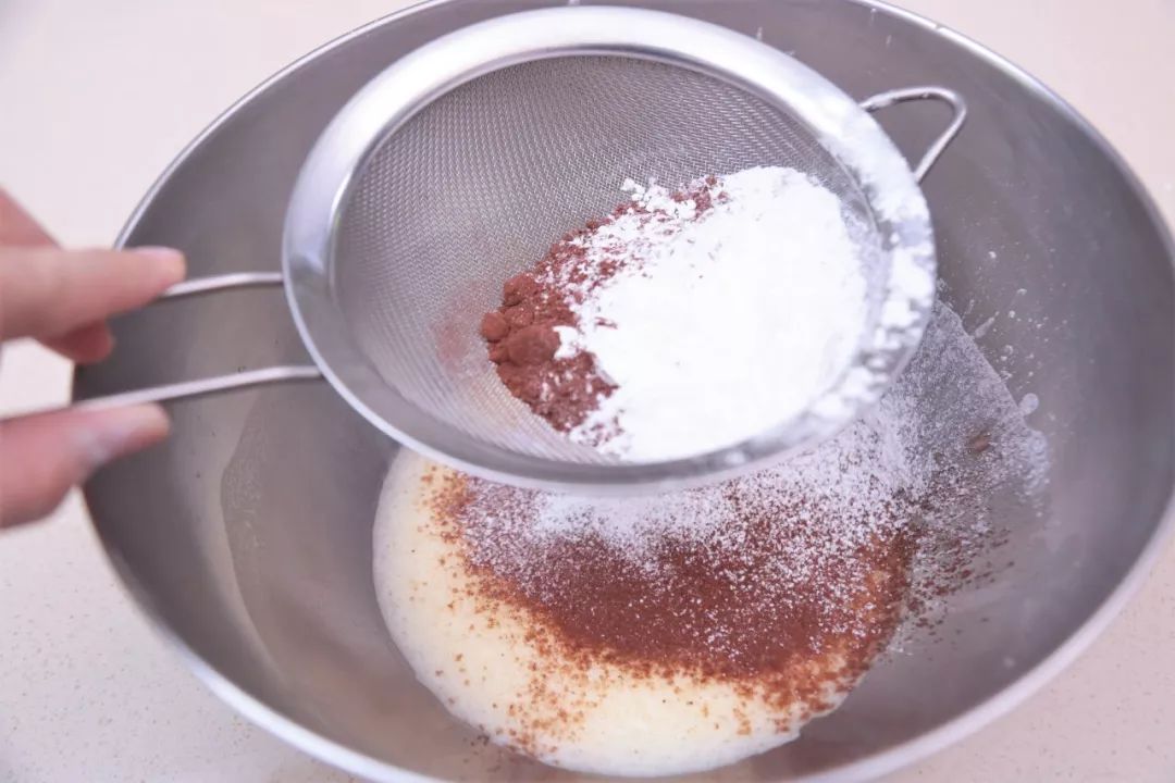 ③过筛加入粘米粉和可可粉,用手动打蛋器搅拌均匀。