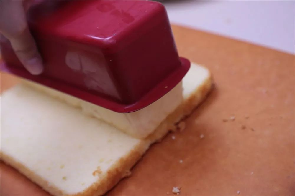 ⑩对比着芝士蛋糕的底面大小,切出海绵蛋糕底。
