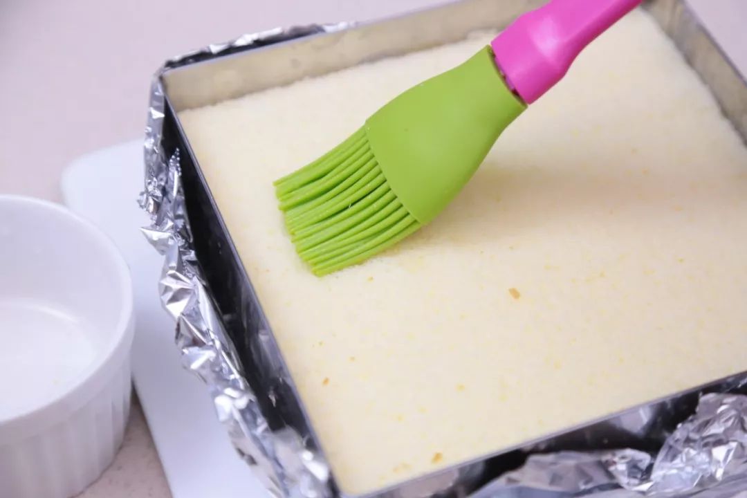 Tip:有些水果含水量比较高,做好的蛋糕容易出水导致凝固力降低,所以水果在使用之前建议用吸水纸吸干水分,然后再铺进模具里。⑥盖上另一片蛋糕片,轻轻压一下让蛋糕与奶油霜贴合,再刷上糖酒液备用。
