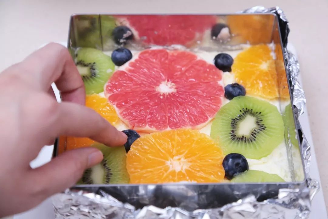 ④取出冷藏好的蛋糕,在表面倒入薄薄一层透明液体,让吉利丁透过蛋糕本身的低温稍微凝固,排上水果片,冷藏20分钟定型。