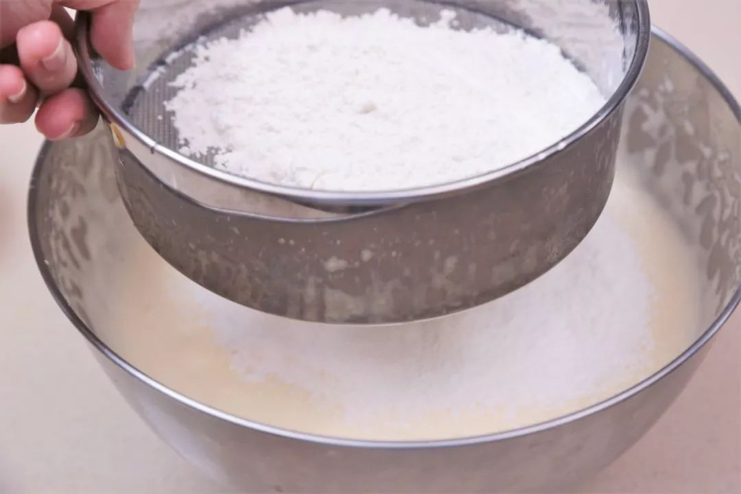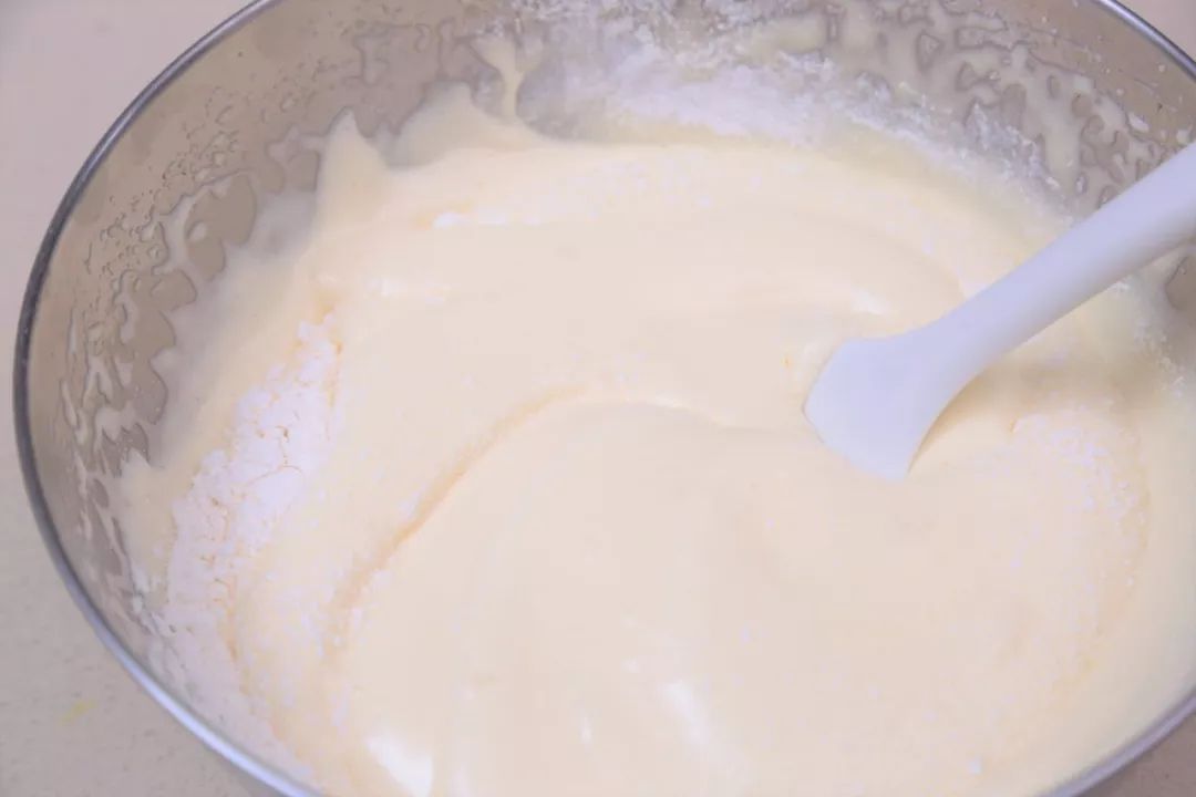 ④将面粉过筛加入搅拌盆中,用刮刀翻拌至看不见干粉。
