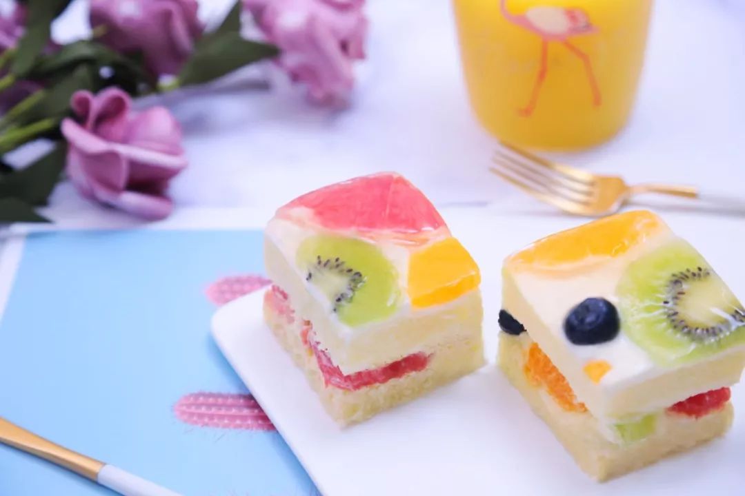 材料模具:18*18cm方形活底模具、8寸方形慕斯圈海绵蛋糕体:全蛋液200g细砂糖80g水饴(或蜂蜜)10g低筋面粉80g玉米淀粉20g黄油25g牛奶40g糖酒液:水30g细砂糖15g朗姆酒10g奶油霜:淡奶油180g糖粉12g酸奶慕斯:原味酸奶35g细砂糖5g淡奶油60g吉利丁片2g透明层:水果(蓝莓、奇异果、蜜柑、西柚等)适量柠檬汁10g水120g细砂糖15g吉利丁片7.5g材料说明:透明层部分的操作,因为吉利丁凝固时间较长,如果在最后一步不想等这么久,也可改用条状琼脂或寒天粉(粉状琼脂)2g替代,与液体一起搅拌后,煮至80摄氏度,让琼脂成分融化,倒入模具大约10分钟即可凝固。步骤准备工作:将烤箱上下管以160摄氏度预热;水果切成片状,两面用厨房纸吸干表面水分备用。