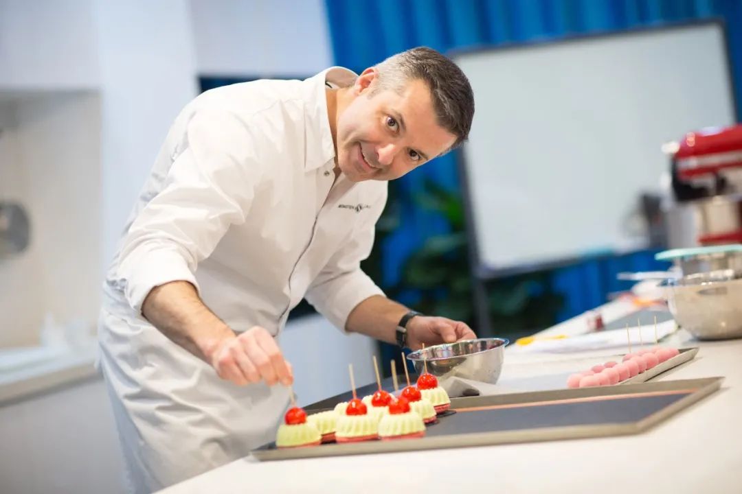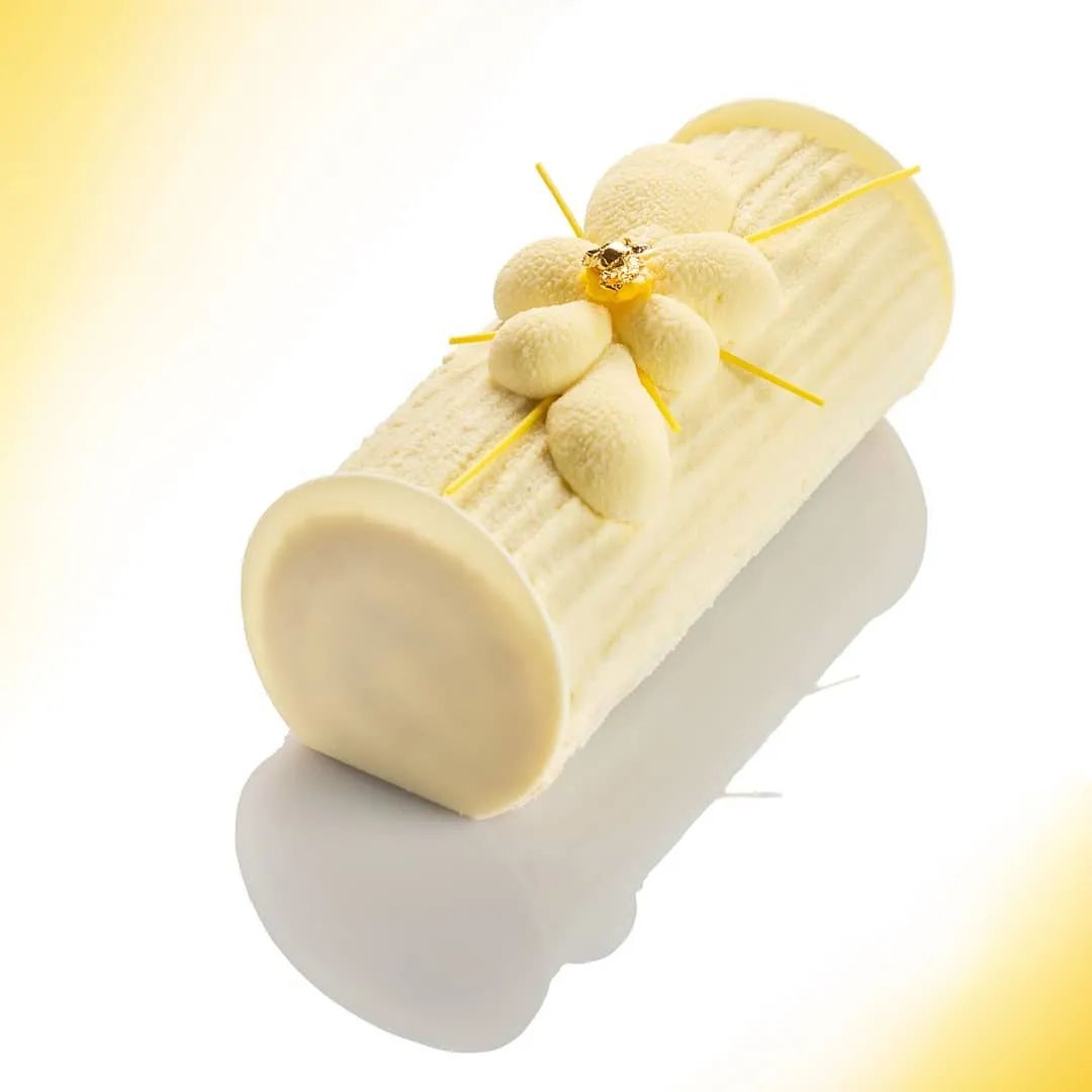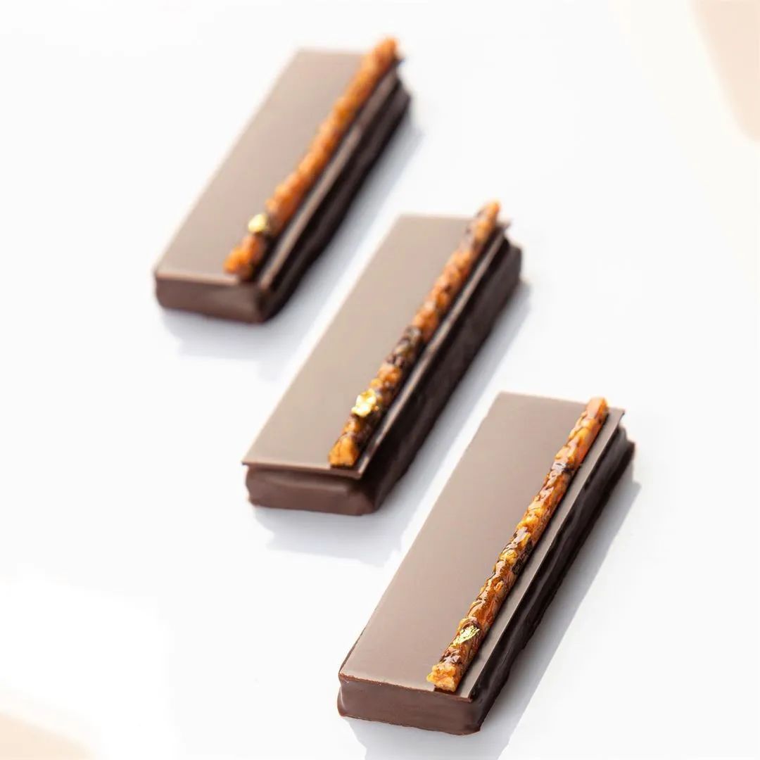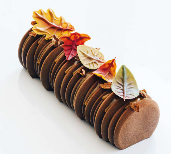 提示:↑点击上方"世界烘焙配方"快速关注cription-url="https://mmbiz.qpic.cn/mmbiz_jpg/PR7JPt3C5zawKVqAvnVjgkJkKicO3wLSfvxkngAAoDWUqJLBBmuPX3tz9EErvItMfV2IGR6HnCYhZnibRA6KM6Ww/0?wx_fmt.jpeg" data-cropselx1="0" data-cropselx2="578" data-cropsely1="0" data-cropsely2="255" data-ratio="1" data-s="300,640" src="http://www.yinpinjie.com/file/upload/202303/11/164951381.png" data-type="png" data-w="1080" />黄金焦糖劈柴,内有梨,非一般梨!来自chef Sébastien Serveau(下图)。amgr☜今日配方下载提取码每天20:30更新,每篇文末左下角“阅读原文”点击进入均可下载当日配方、视频或图片文件,省去大家自己复制黏贴的麻烦,配方文件无任何水印设置;“提取码”因近日度娘抽风搞怪,暂不提供无码下载服务,只能按她的规矩来,所以下载之前先把这个“提取码”复制一下~另外,部分地区可能因为某些不可抗原因导致无法直接点击阅读原文,可以在文末的【置顶留言】中找到链接和提取码。焦糖梨子巧克力劈柴蛋糕CHOCOLATEPEAR CARAMELLOGbySébastien Serveau模具:Kit Ali di Fata pour Bûche de Noël - SILIKOMART®(下图)配方量:2个焦糖梨子【860克】200 克……细砂糖 75 克……水375 克……热水160 克……梨子(不要太熟的) 50 克……柠檬汁制作:1、将75克水与细砂糖在厚底平底锅内加热至195℃煮成焦糖。2、同时,将梨子去皮切十等份,放入柠檬汁内。3、将375克热水缓慢冲入“步骤1”的焦糖内将焦糖融化,并再次煮沸,然后将过滤后的梨子放入。4、再次煮沸后,放入密封容器中,室温冷却后,放入冷藏12小时。注意:糖要快速加热以免过度着色。焦糖奶油【410.5克】220 克……35%淡奶油 20 克……葡萄糖浆0.5 个……香草荚100 克……细砂糖 50 克……蛋黄 20 克……吉利丁冻(200Bloom)制作:1、将淡奶油、葡萄糖浆和香草(剖开刮籽)煮沸。2、将细砂糖在厚底平底锅中加热至190℃,煮成干焦糖,然后将“步骤1”热的液体分次冲入将干焦糖融化。3、倒在打散的蛋黄上,搅拌均匀,然后再倒回锅内加热搅拌制成82℃的英式奶酱,加入吉利丁冻拌融。4、保鲜膜贴面密封,静置待用。注意:“步骤2”操作时,热的液体要分次缓慢冲入,以免溅起烫伤。巧克力海绵蛋糕【443克】 50 克……蛋黄130 克……全蛋 50 克……细砂糖 40 克……红糖#1 80 克……蛋白 35 克……红糖#2 30 克……T45面粉 28 克……可可粉制作:1、将蛋黄、全蛋、细砂糖和40克红糖混合打发。2、同时将蛋白与35克红糖打发为蛋白霜。3、将两者混合拌匀后,加入混合过筛的粉类拌匀。4、倒入60x40cm的烤盘中(半盘量),入烤箱以190℃烘烤约8分钟。5、出炉冷却后,裁切为2个24x11.5cm和2个24x4cm的长方形待用。夹心组装1、将硅胶模具内铺入一片24x11.5cm的长方形巧克力海绵蛋糕。2、挤入80克焦糖奶油,放入80克切丁梨子。3、再挤入80克焦糖奶油,然后放上一片24x4cm的长方形巧克力海绵蛋糕封底,冷冻。杏仁巧克力酥脆片【240克】50 克……32%黄金牛奶巧克力70 克……栗子帕林内(50%)50 克……杏仁碎70 克……花生碎制作:1、将杏仁碎和花生碎入烤箱以150℃烘烤约20分钟。2、将巧克力融化加入栗子帕林内拌匀,加入烤熟的坚果碎拌匀,涂抹为4毫米厚度均匀片状,冷藏。3、裁切为24.5x5.5cm的长方形,静置待用。注意:巧克力融化温度不要超过35℃,此温度内加入帕林内混合会获得最佳状态。黄金巧克力焦糖慕斯【1488.7克】100 克……细砂糖225 克……35%淡奶油#1 60 克……蛋黄0.7 克……细盐 53 克……吉利丁冻(200Bloom)375 克……黄金巧克力675 克……35%淡奶油#2制作:1、将675克淡奶油打发至软尖峰状态。2、将砂糖煮至190℃的干焦糖,缓慢冲入另外225克煮热的淡奶油将焦糖融化。3、冲入打散的蛋黄中搅拌均匀后倒回锅内中小火加热至82℃,期间保持不间断搅拌(即制作英式奶酱),然后加入盐和吉利丁冻拌匀。4、分三次冲入巧克力中,用搅拌器搅拌至顺滑。5、降温至40℃时,将“步骤1”打发的淡奶油搅入轻轻拌匀。黄金巧克力甘纳许【305克】 55 克……35%淡奶油#1 10 克……葡萄糖浆 10 克……转化糖浆 80 克……32%黄金牛奶巧克力150 克……35%淡奶油#2制作:1、将55克淡奶油与葡萄糖浆、转化糖浆混合煮沸。2、倒在巧克力上,用手持均质机充分搅拌乳化至光滑细腻。3、再将另外150克液态冷藏淡奶油加入乳化,冷藏至少4小时后打发使用。黄金巧克力片【50克】50 克……32%黄金牛奶巧克力制作:1、巧克力融化调温后涂在透明塑料片上。2、裁切为2个24x2cm的长条形,覆盖上另一张透明塑料片,静置待凝固结晶。镜面淋面【550克】500 克……镜面果胶 50 克……水制作:1、全部混合加热,最佳使用温度为80℃。组装&装饰1、将“巧克力海绵蛋糕”铺入小号的夹心模具内。2、挤入80克“焦糖奶油”。3、铺入过滤后的“焦糖梨子”,然后再挤入80克“焦糖奶油”,速冻。4、在模具内挤入500克“黄金巧克力焦糖慕斯”,放入冷冻脱模的“步骤3”夹心,轻轻按压后铺上一片“杏仁巧克力酥脆片”。5、脱模后,放上长条形的“黄金巧克力片”,并在巧克力片上挤“黄金巧克力甘纳许”。6、裁切整齐(按所需长度)。7、两端装饰巧克力,表面点缀金箔纸。喜欢原汁原味,继续看CHEF的法语版amgr☜今日配方下载提取码每天20:30更新,每篇文末左下角“阅读原文”点击进入均可下载当日配方、视频或图片文件,省去大家自己复制黏贴的麻烦,配方文件无任何水印设置;“提取码”因近日度娘抽风搞怪,暂不提供无码下