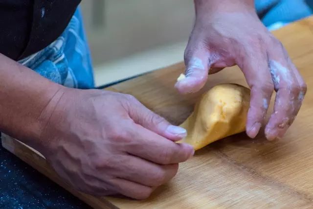【7】捏地瓜球轻捏小面团,把边缘捏圆。Tips▼