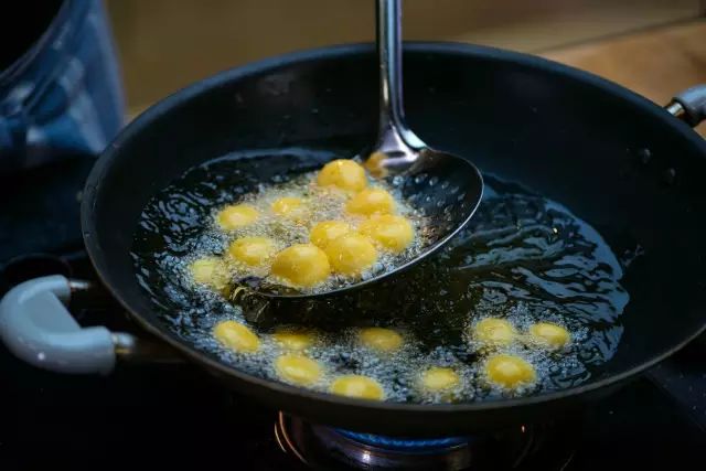 【8】炸地瓜球将油温烧至120摄氏度,然后将地瓜球放入锅中炸。Tips▼