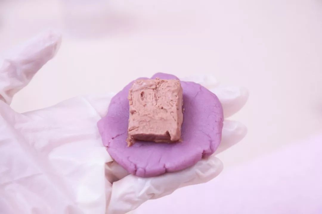 ③将桃山皮包住冰淇淋块,快手塑形成圆形。TIP:因为冰淇淋包的时候会融化,操作需要尽量快速,并且尽量不让手温影响冰淇淋的状态。