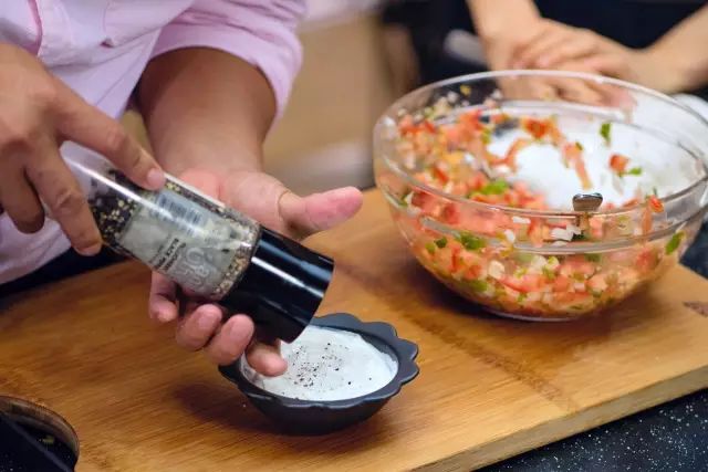 【3】做蔬菜沙拉将切好的洋葱末、剥皮辣椒丁、西红柿丁、香菜末放入碗中,加入适量的盐、橄榄油、黑胡椒搅拌均匀。