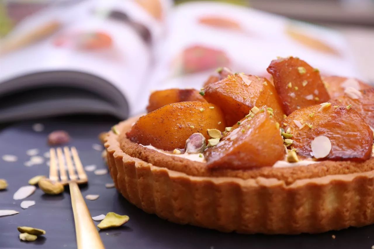 ②把冷藏好的朗姆肉桂酒渍柿子摆放在涂好奶油的塔底上,刷上剩余的柿子糖液增加亮泽感,撒上烤过的大杏仁片和开心果碎即可。