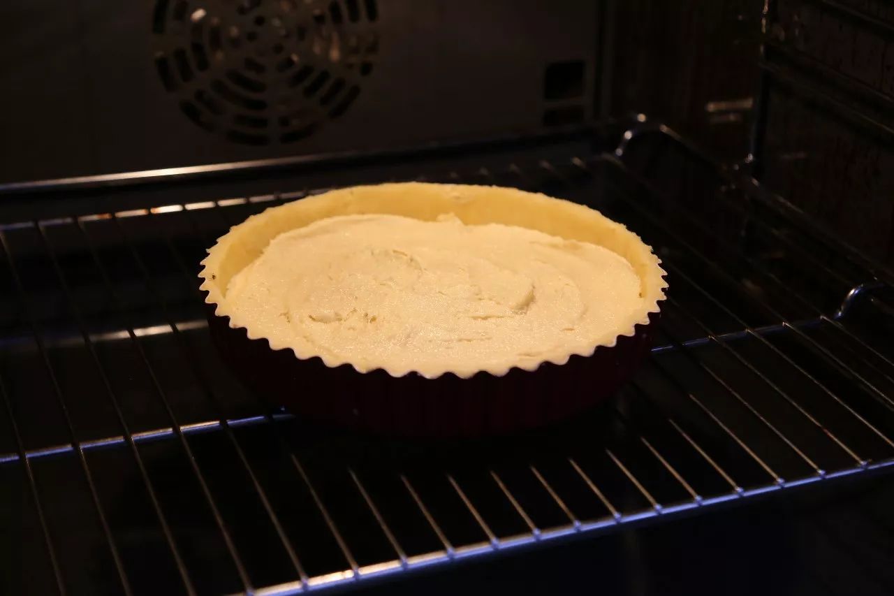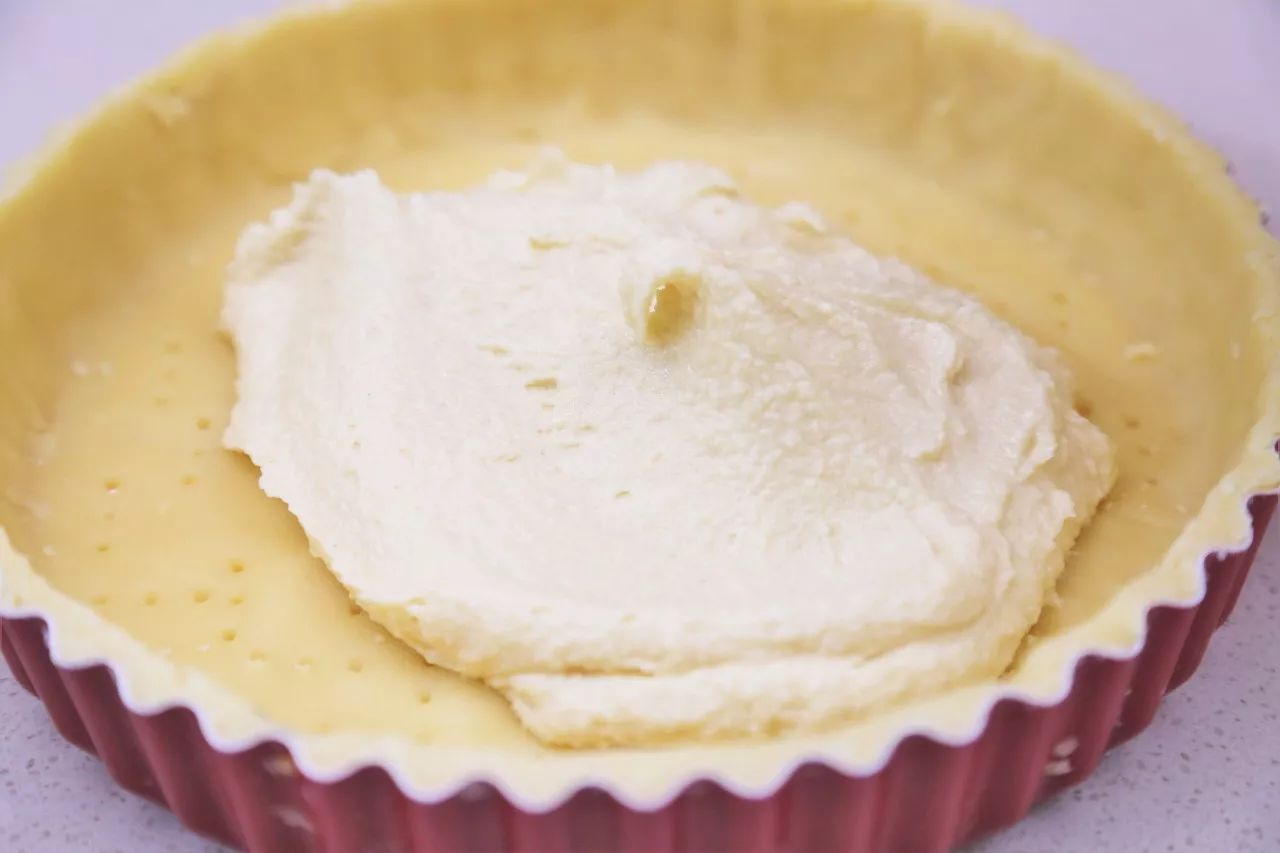 ④用叉子在挞皮底部均匀戳洞,接着把挞模放进冰箱冷藏。这时候可以开始以上下管摄氏190度预热烤箱。