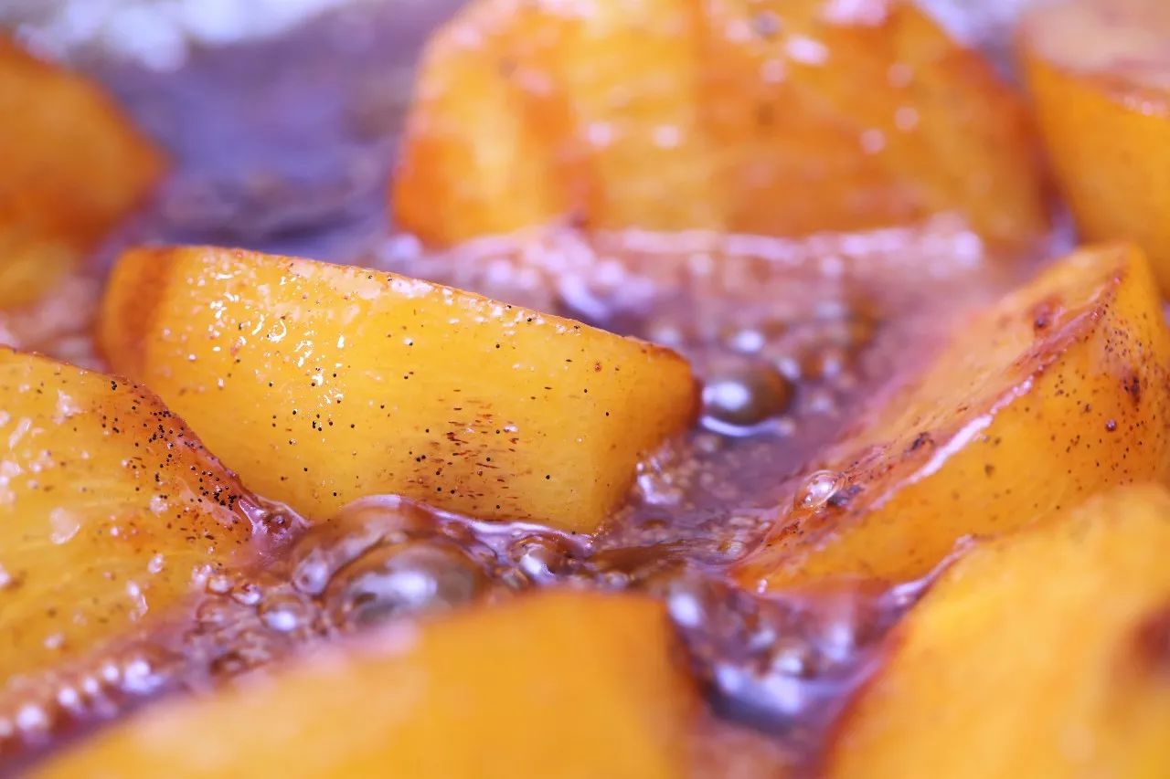 ②细砂糖放入平底锅,小火加热至淡茶色液态后马上关火,加入无盐黄油和朗姆酒,搅拌均匀后,再次开火加热至沸腾,倒入切好的柿子用木勺轻轻翻炒略煮至汁液微微渗出(但不要把柿子完全煮软了,还是要保留脆度哦),关火加入肉桂粉拌匀(如有条件,可以加半根香草荚),将柿子冷藏至完全冰凉,锅中剩余的柿子糖浆保存备用。